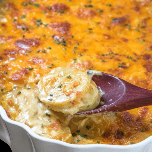 Creamy scalloped potatoes baked in garlic-cheddar sauce. Easy, cheesy, and perfect for any dinner table.