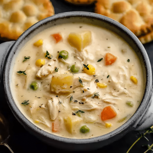 Creamy chicken pot pie soup made easy — full of tender chicken, veggies, and classic pot pie flavor in a cozy soup.
